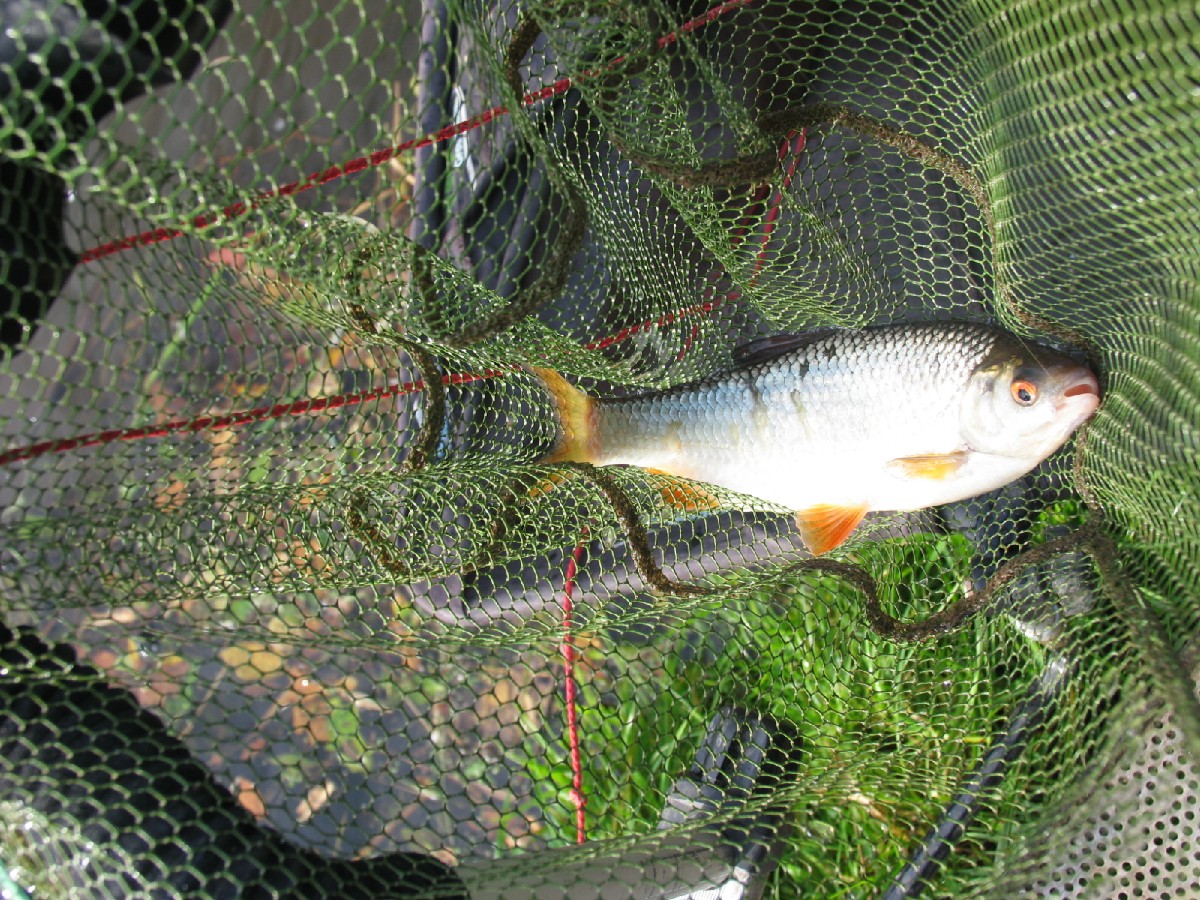 Die ersten 15 Minuten vergingen ohne einen Biss. Danach stellte ich die Pose 5 cm tiefer und bekam den ersten Biss. Nach kurzen Drill konnte ich ein gutes Rotauge fangen.